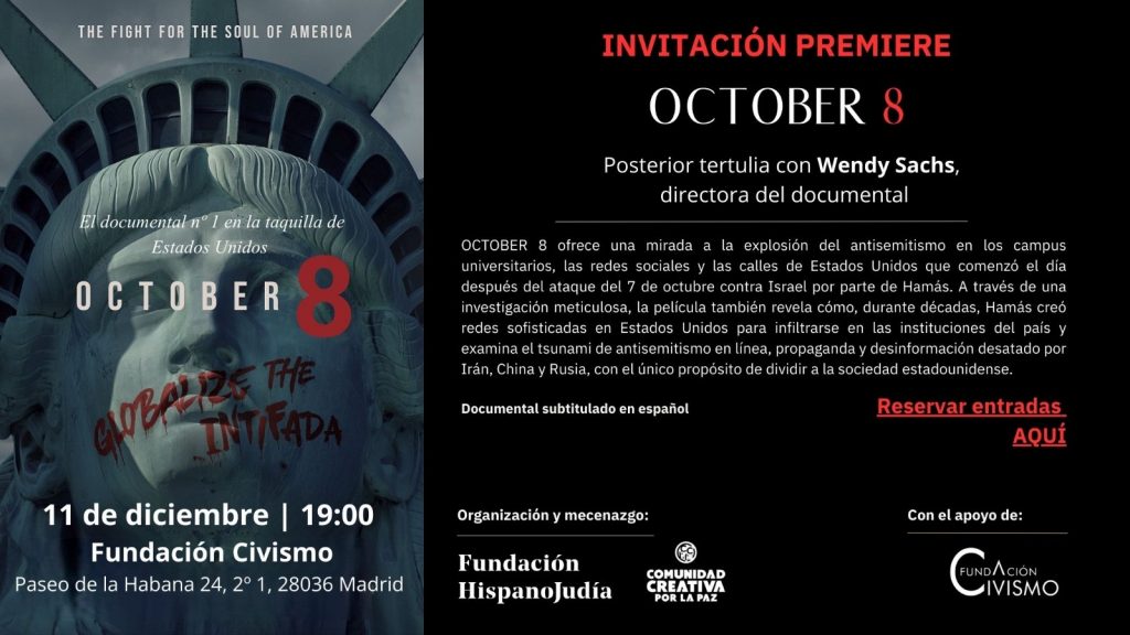 La Fundación Civismo acogió ayer el visionado del documental October 8, dirigido por Wendy Sachs, un acto organizado por la Fundación Hispanojudía y la Comunidad Creativa por la Paz.