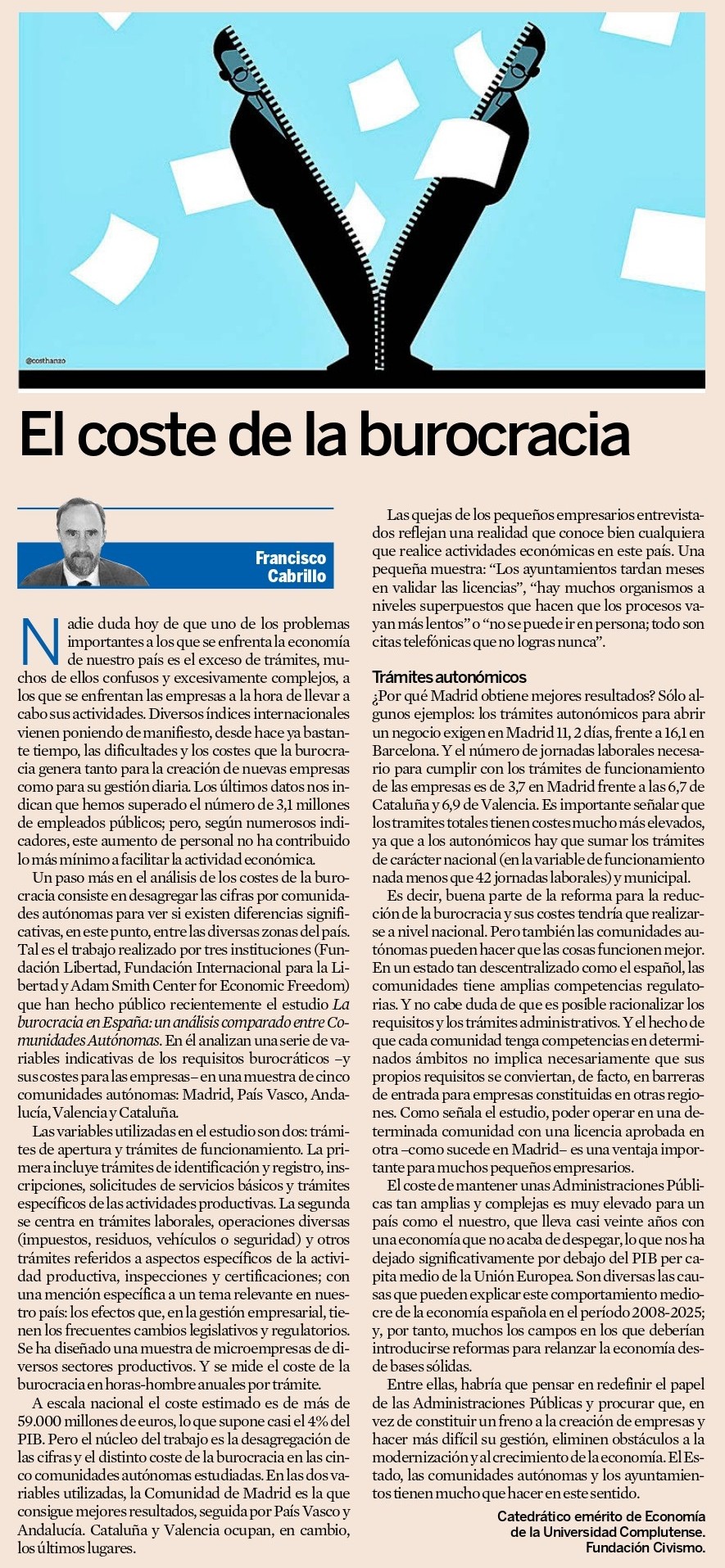 Nadie duda hoy de que uno de los problemas importantes a los que se enfrenta la economía de nuestro país es el exceso de trámites, muchos de ellos confusos y excesivamente complejos, a los que se enfrentan las empresas a la hora de llevar a cabo sus actividades. Diversos índices internacionales vienen poniendo de manifiesto, desde hace ya bastante tiempo, las dificultades y los costes que la burocracia genera tanto para la creación de nuevas empresas como para su gestión diaria. Los últimos datos nos indican que hemos superado el número de 3,1 millones de empleados públicos; pero, según numerosos indicadores, este aumento de personal no ha contribuido lo más mínimo a facilitar la actividad económica…