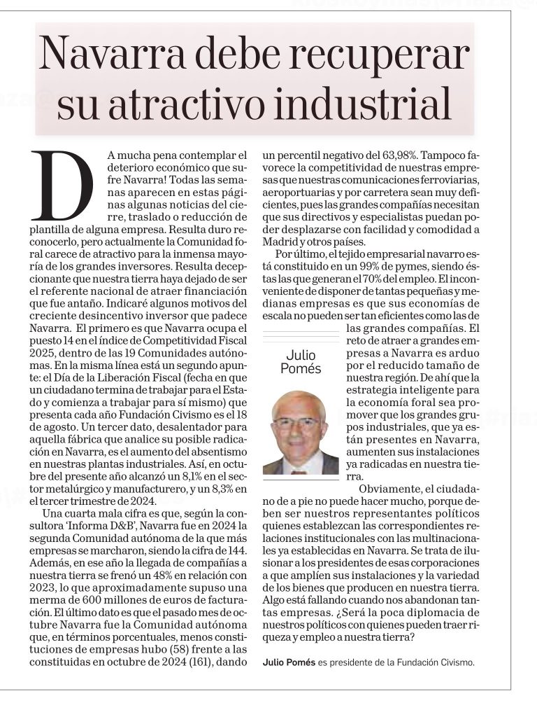 ¡Da mucha pena contemplar el deterioro económico que sufre Navarra! Todas las semanas aparecen en estas páginas algunas noticias del cierre, traslado o reducción de plantilla de alguna empresa. Resulta duro reconocerlo, pero actualmente la Comunidad foral carece de atractivo para la inmensa mayoría de los grandes inversores. Resulta decepcionante que nuestra tierra haya dejado de ser el referente nacional de atraer financiación que fue antaño. Indicaré algunos motivos del creciente desincentivo inversor que padece Navarra…