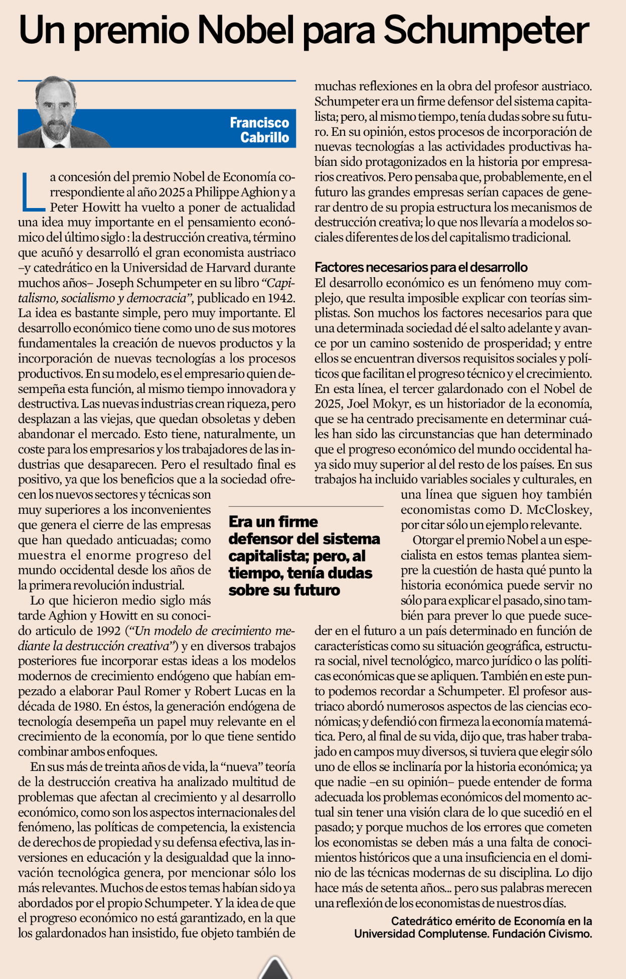 La concesión del premio Nobel de Economía correspondiente al año 2025 a Philippe Aghion y a Peter Howitt ha vuelto a poner de actualidad una idea muy importante en el pensamiento económico del último siglo: la destrucción creativa, término que acuñó y desarrolló el gran economista austriaco —y catedrático en la Universidad de Harvard durante muchos años— Joseph Schumpeter en su libro…