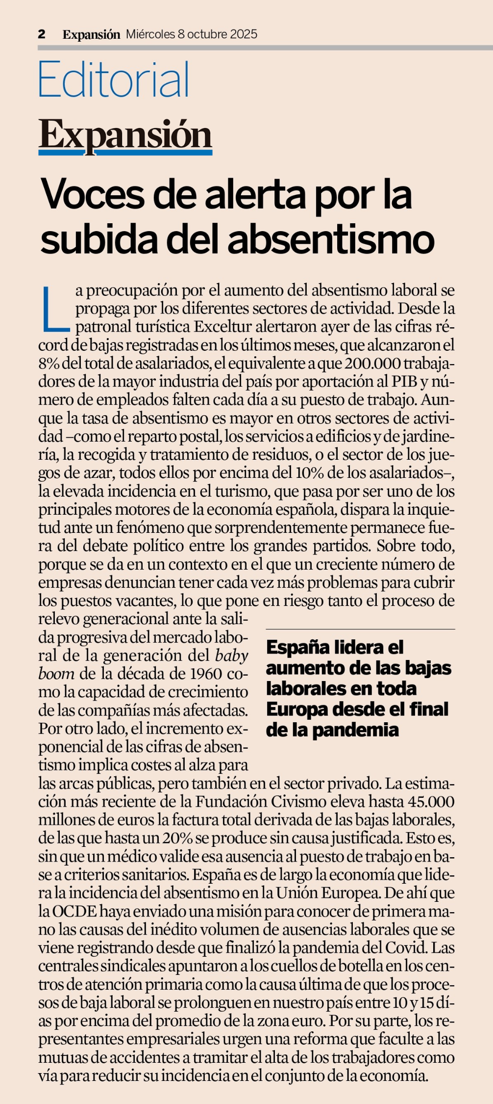 La preocupación por el aumento del absentismo laboral se propaga por los diferentes sectores de actividad. Desde la patronal turística Exceltur alertaron ayer de las cifras récord de bajas registradas en los últimos meses, que alcanzaron el 8% del total…